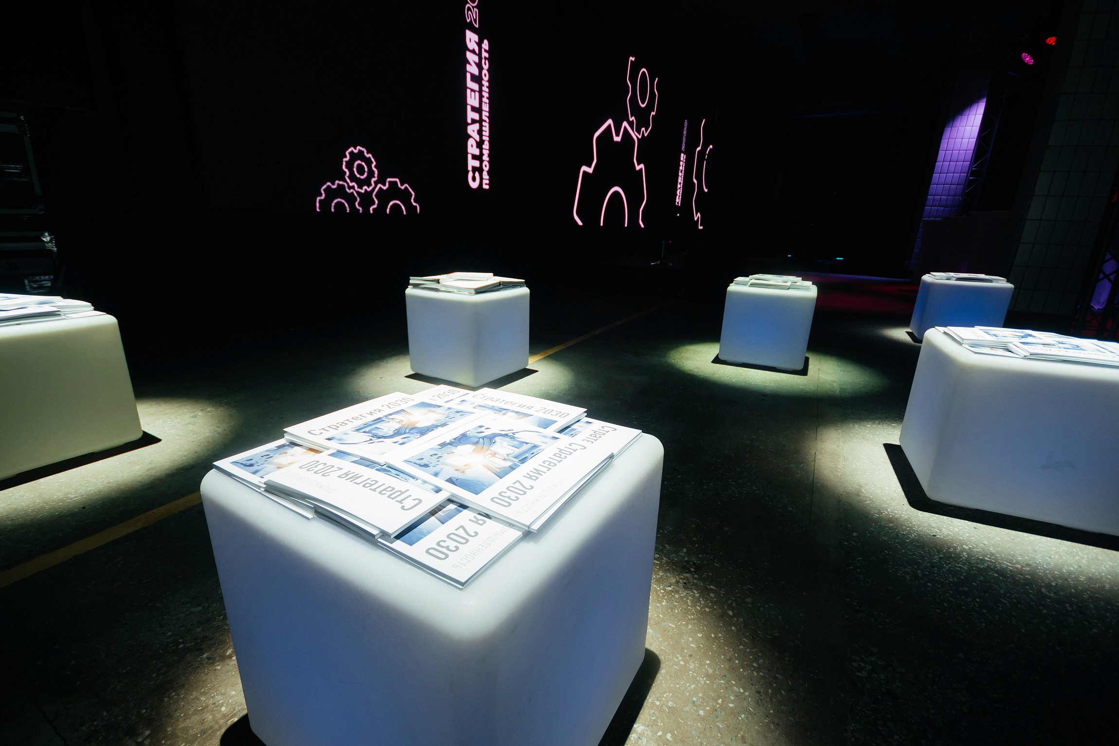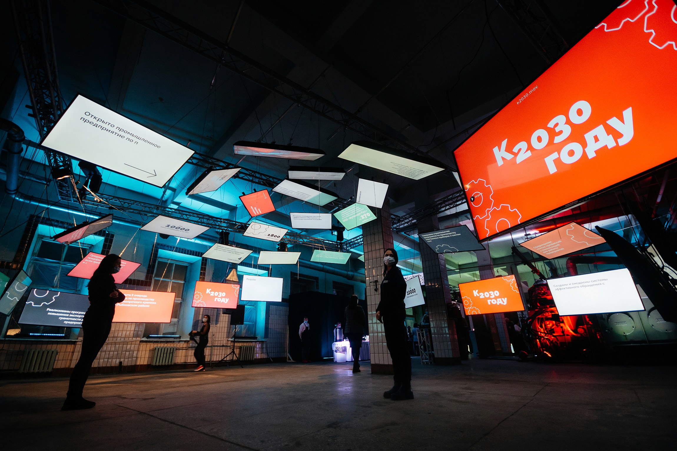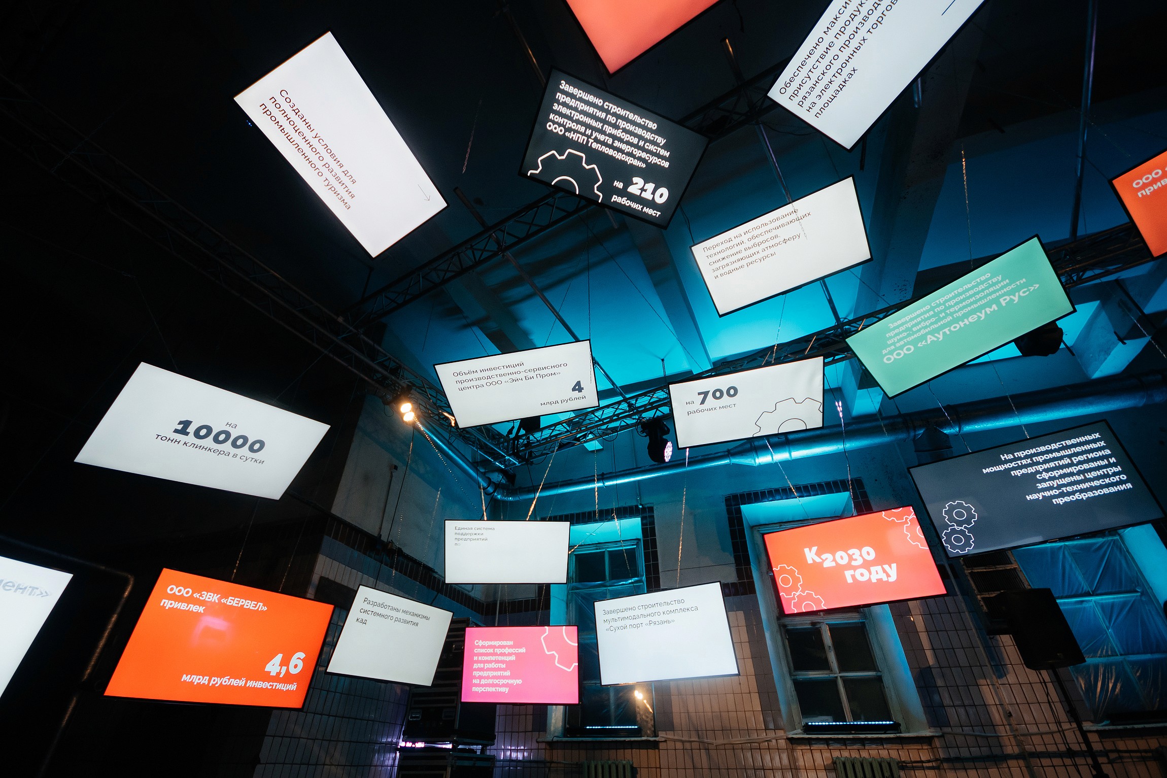 Отдельным концептуальным решением стал сам выбор индустриального пространства. Контраст между пустующим производственным цехом и современной мультимедийной подачей усиливал главный смысл стратегии — обновление и развитие промышленности региона.