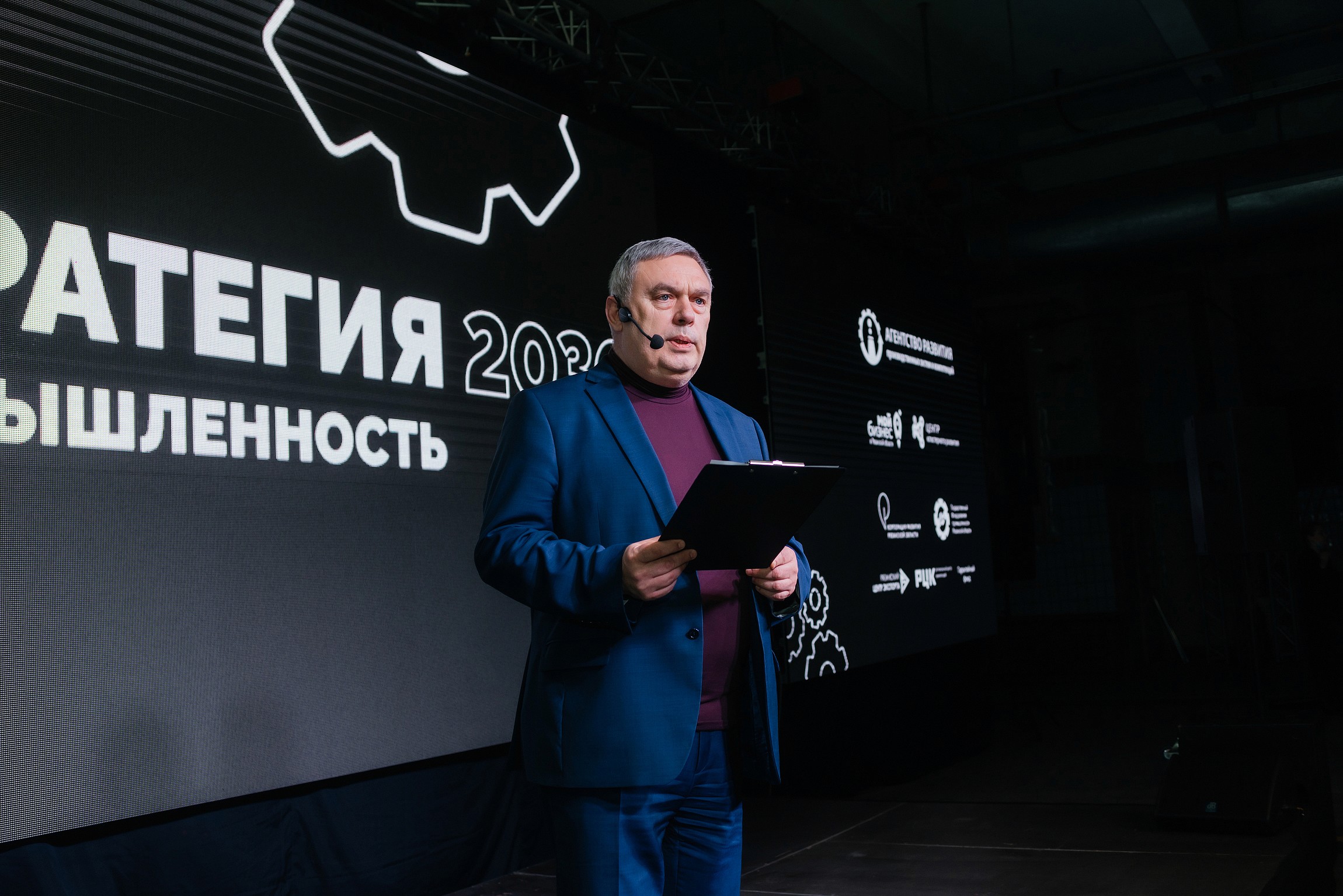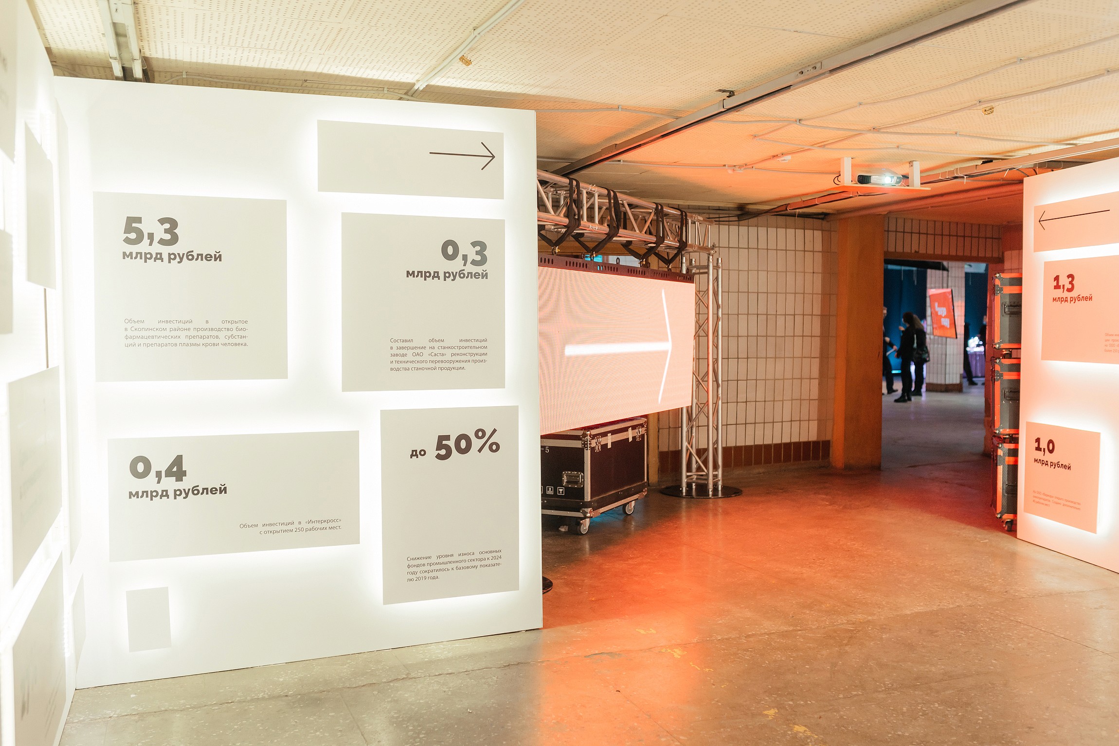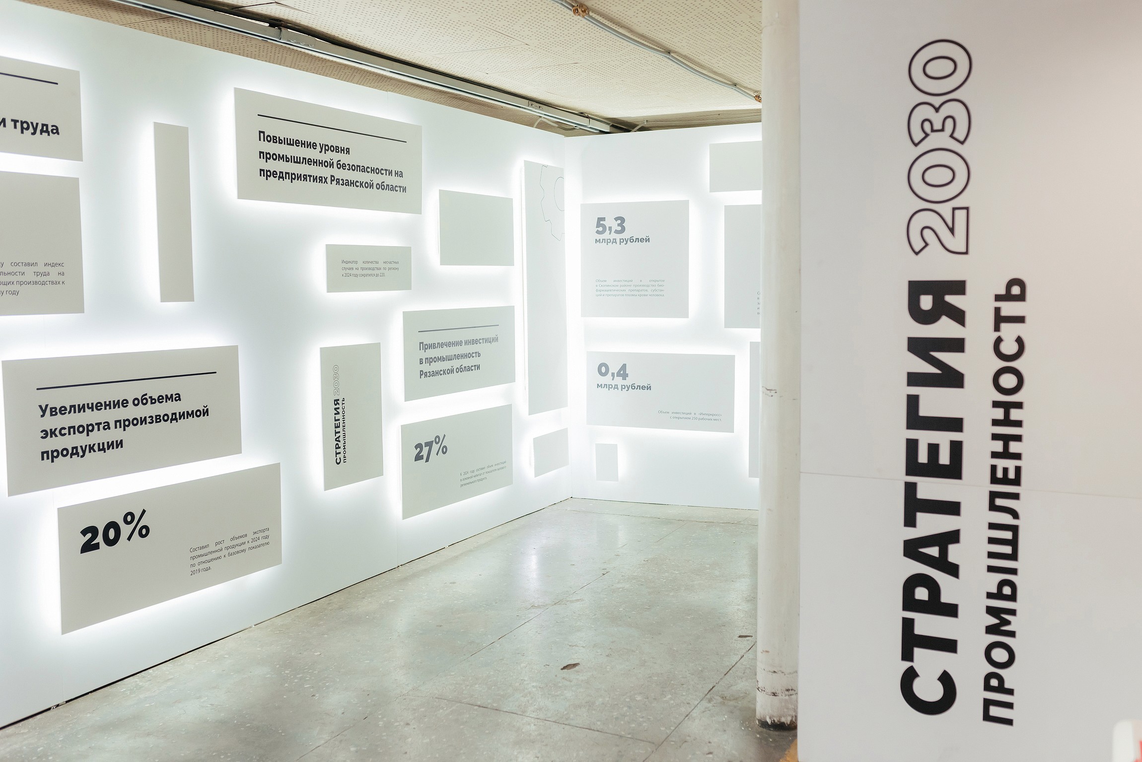Отдельным концептуальным решением стал сам выбор индустриального пространства. Контраст между пустующим производственным цехом и современной мультимедийной подачей усиливал главный смысл стратегии — обновление и развитие промышленности региона.